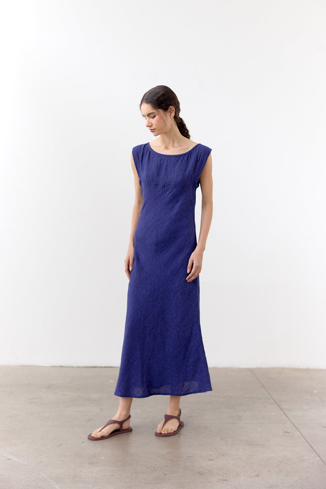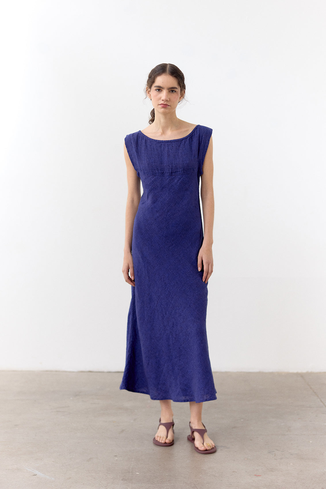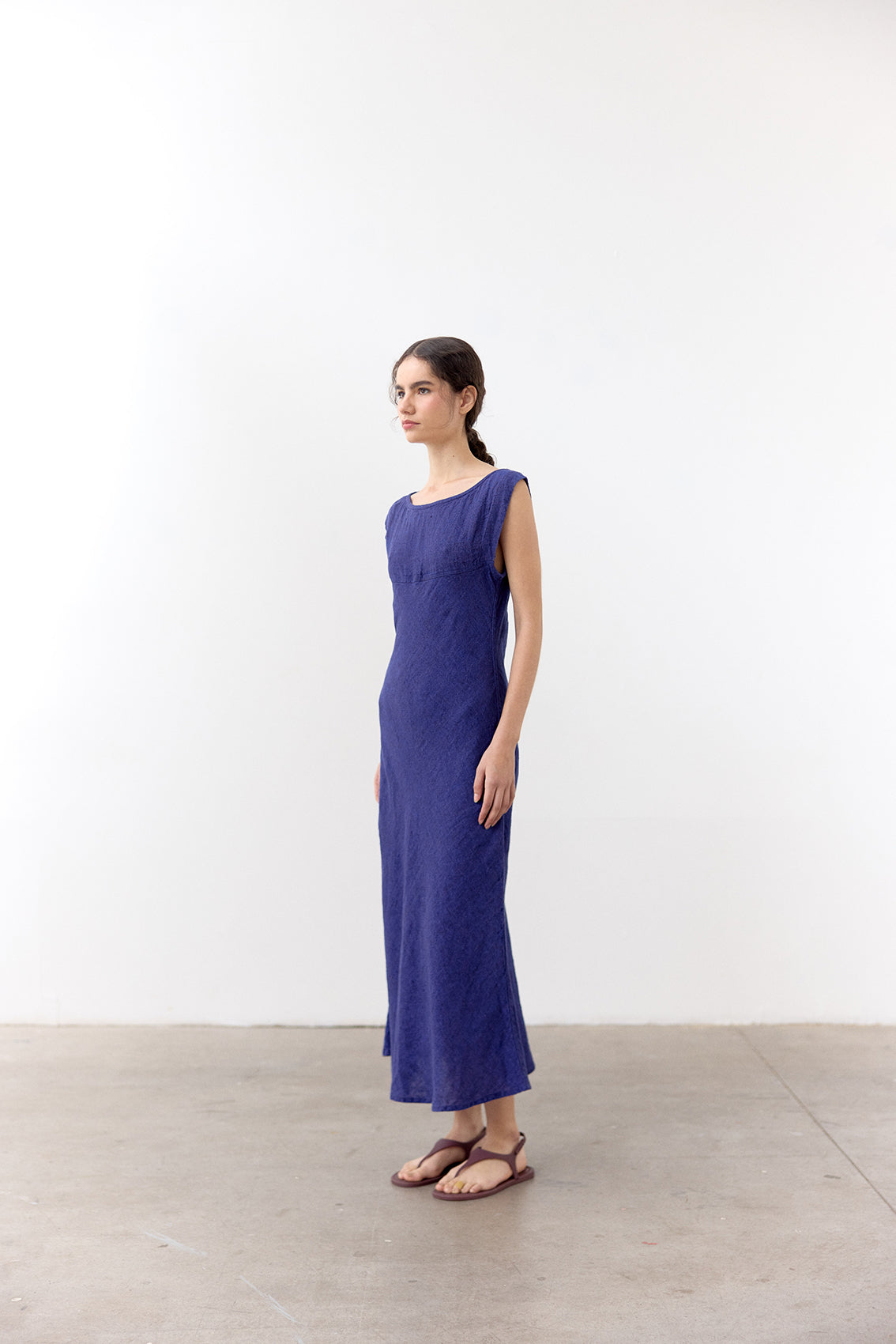 Long linen dress cut on the bias for a relaxed silhouette. Crafted in 100% stone-washed linen, constructed with a subtle mélange effect.