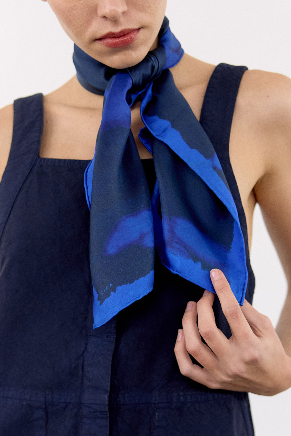 Square 70 x 70 cm scarf, crafted in 100% habotai sandwashed silk. Hand-rolled finishings.