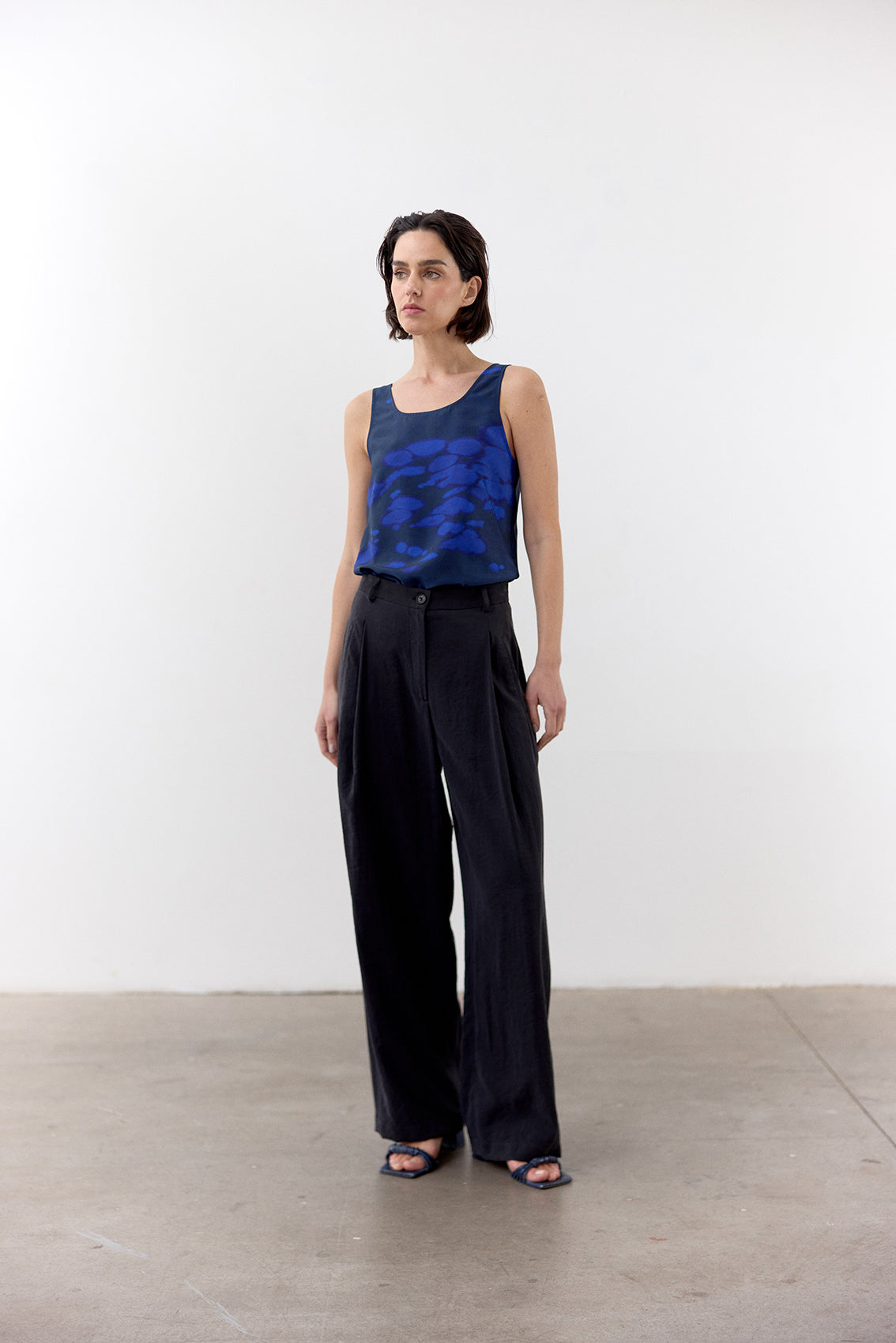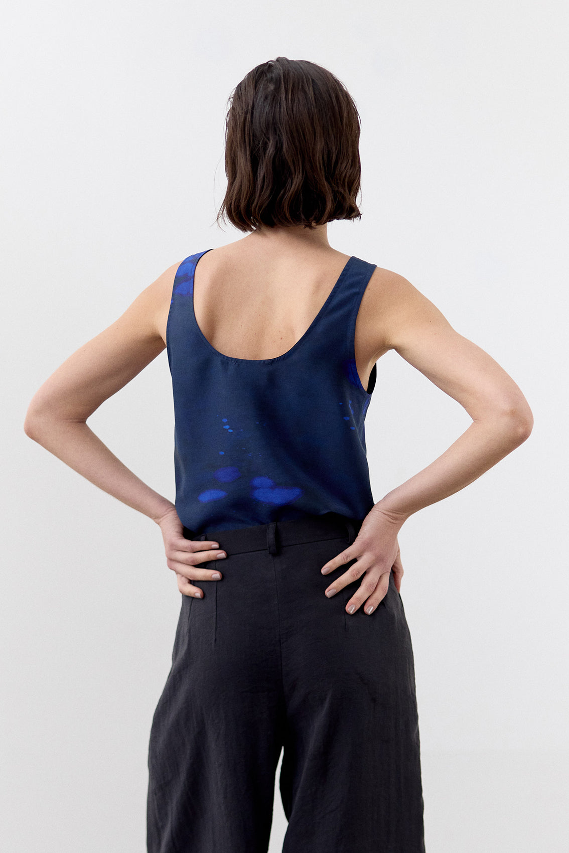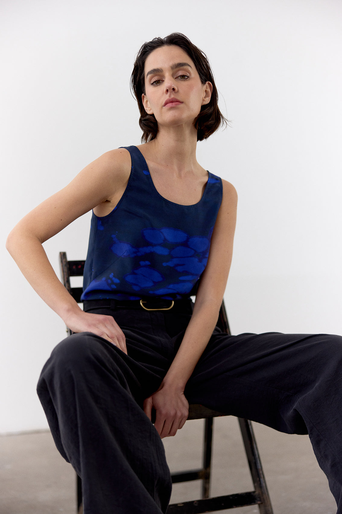 Essential sleeveless top, printed in 100% habotai sandwashed silk.