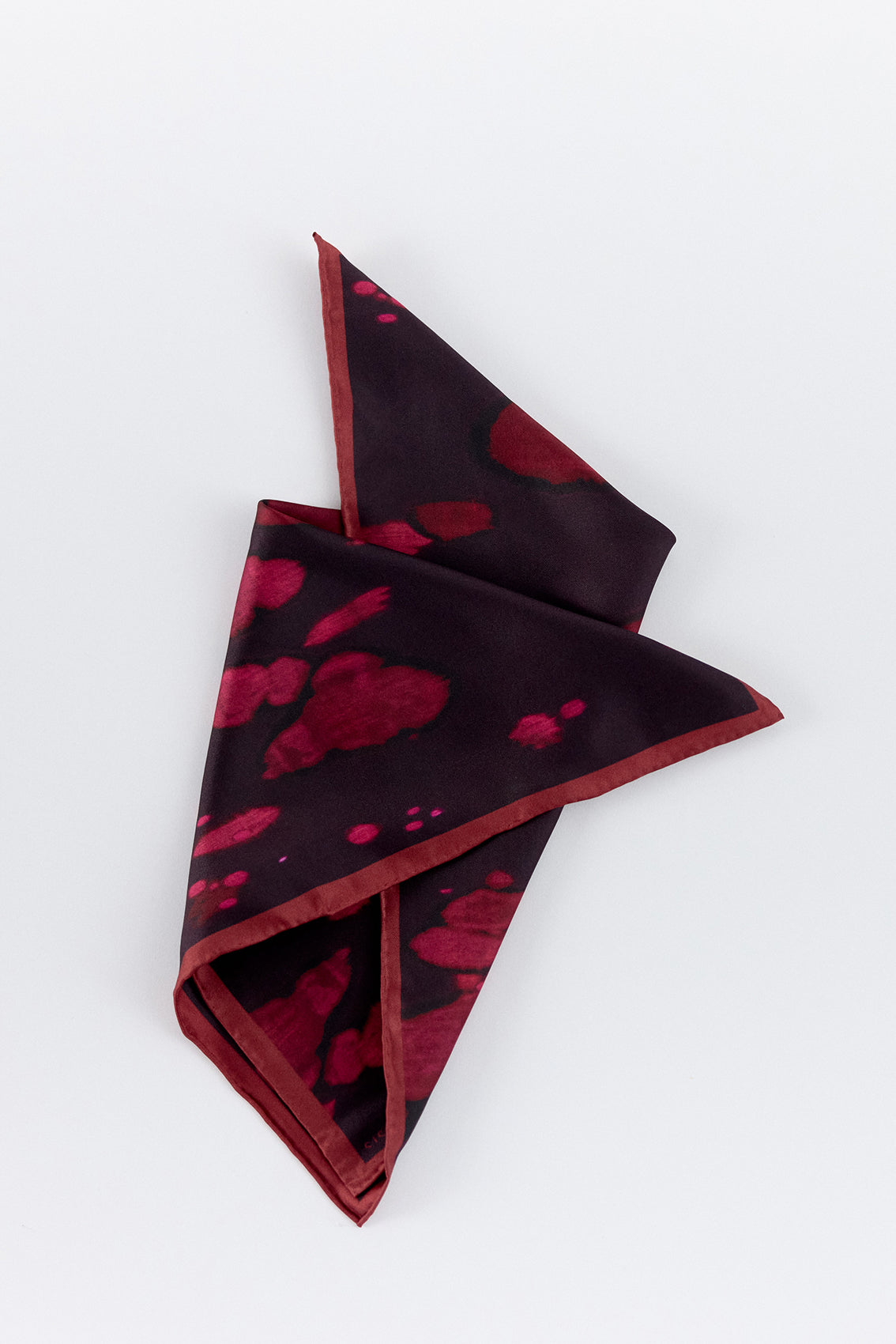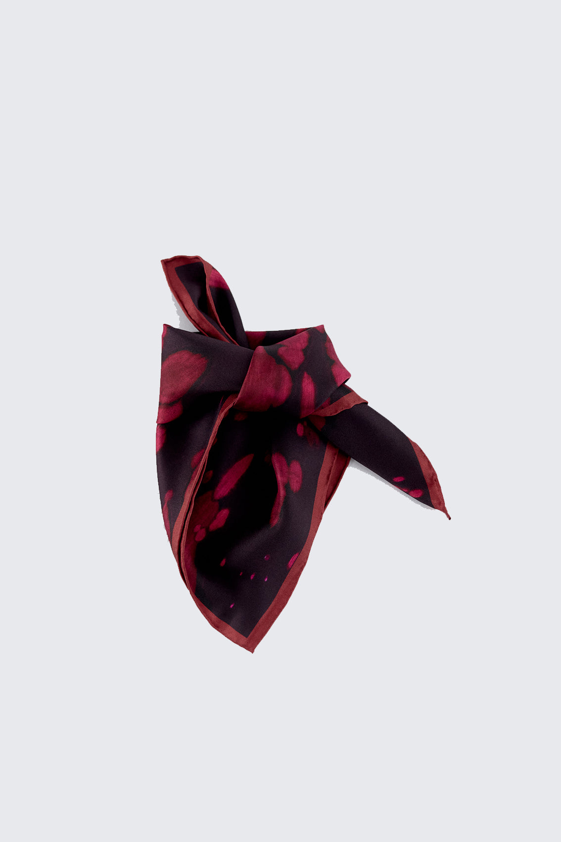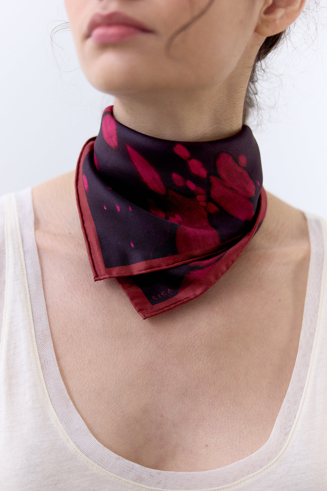 Square 45 x 45 cm scarf, crafted in 100% habotai sandwashed silk. Hand-rolled finishings.