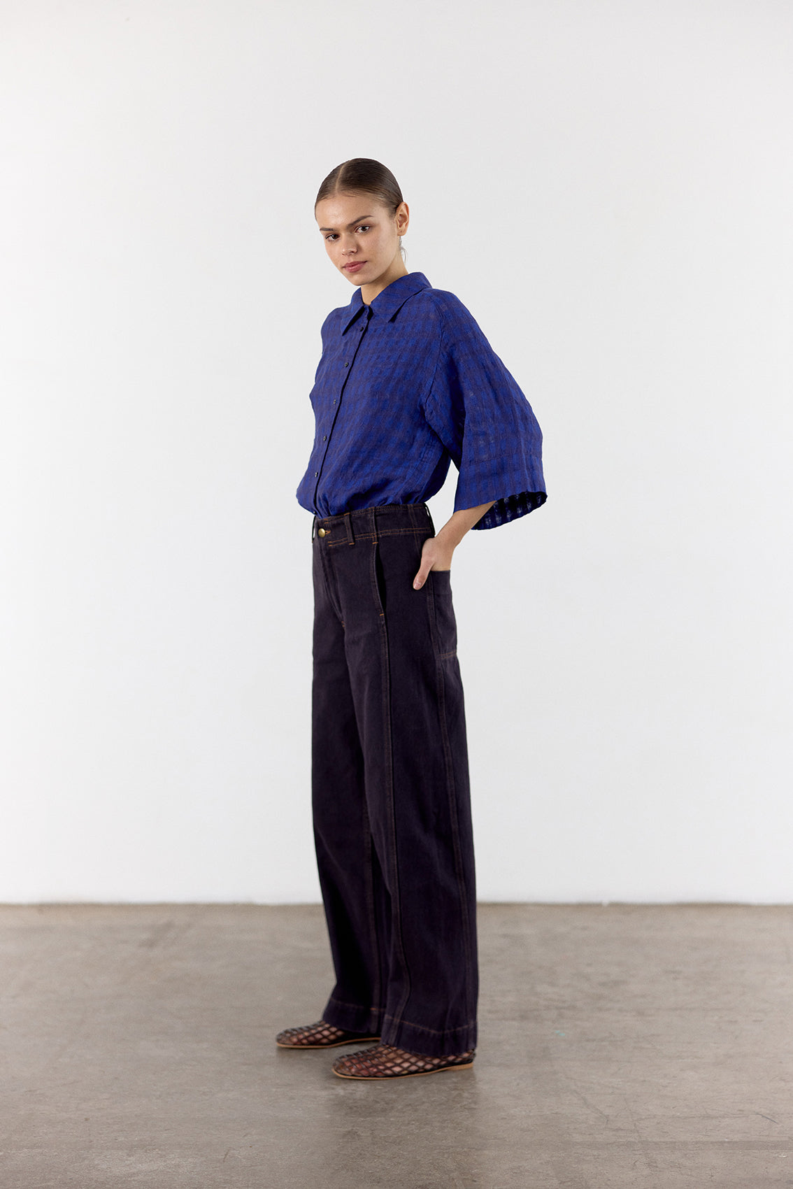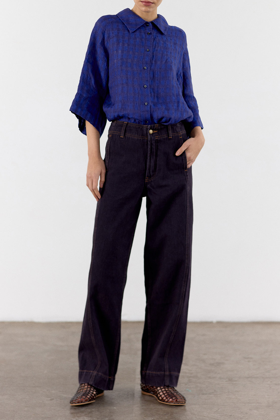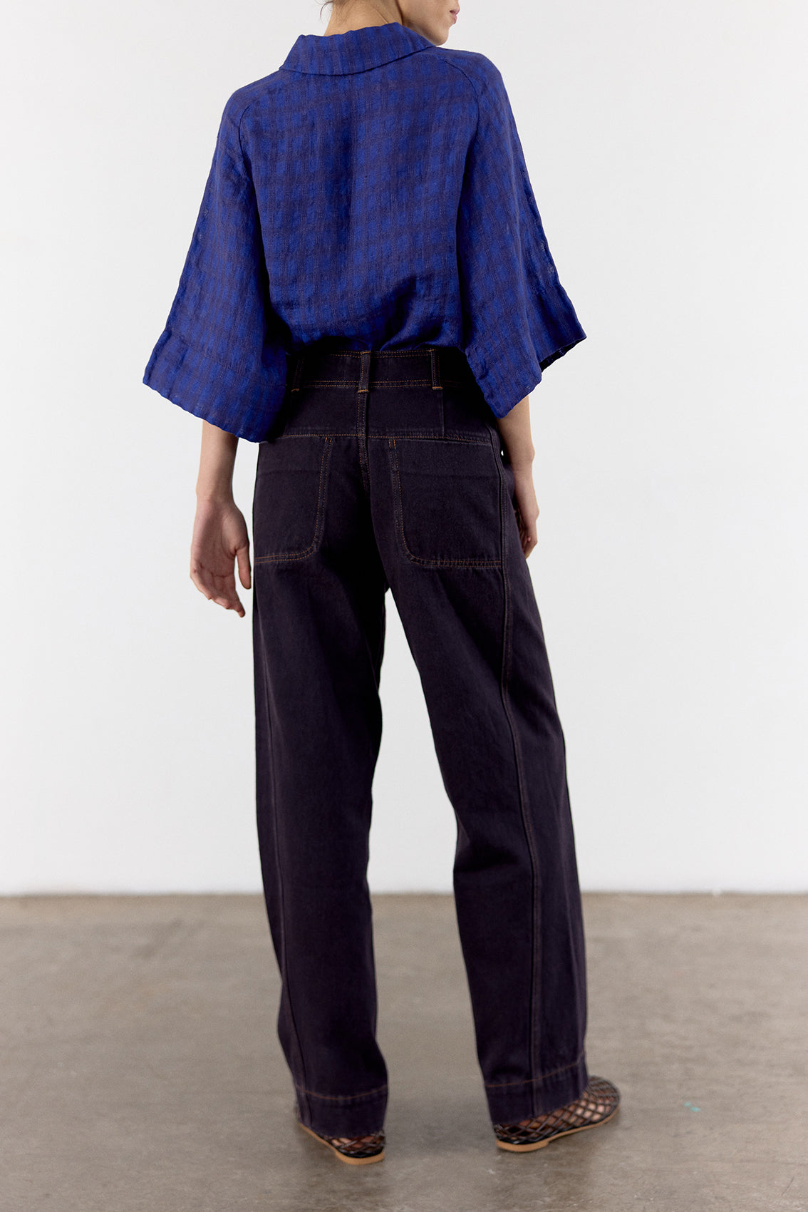 Straight-leg recycled denim jeans, made in 100% cotton. A timeless silhouette with unique design details. These jeans feature subtly displaced lateral cuts that form a flattering side panel where the front and integrated back pockets meet. Finished with classic denim double stitching and a washed denim effect.