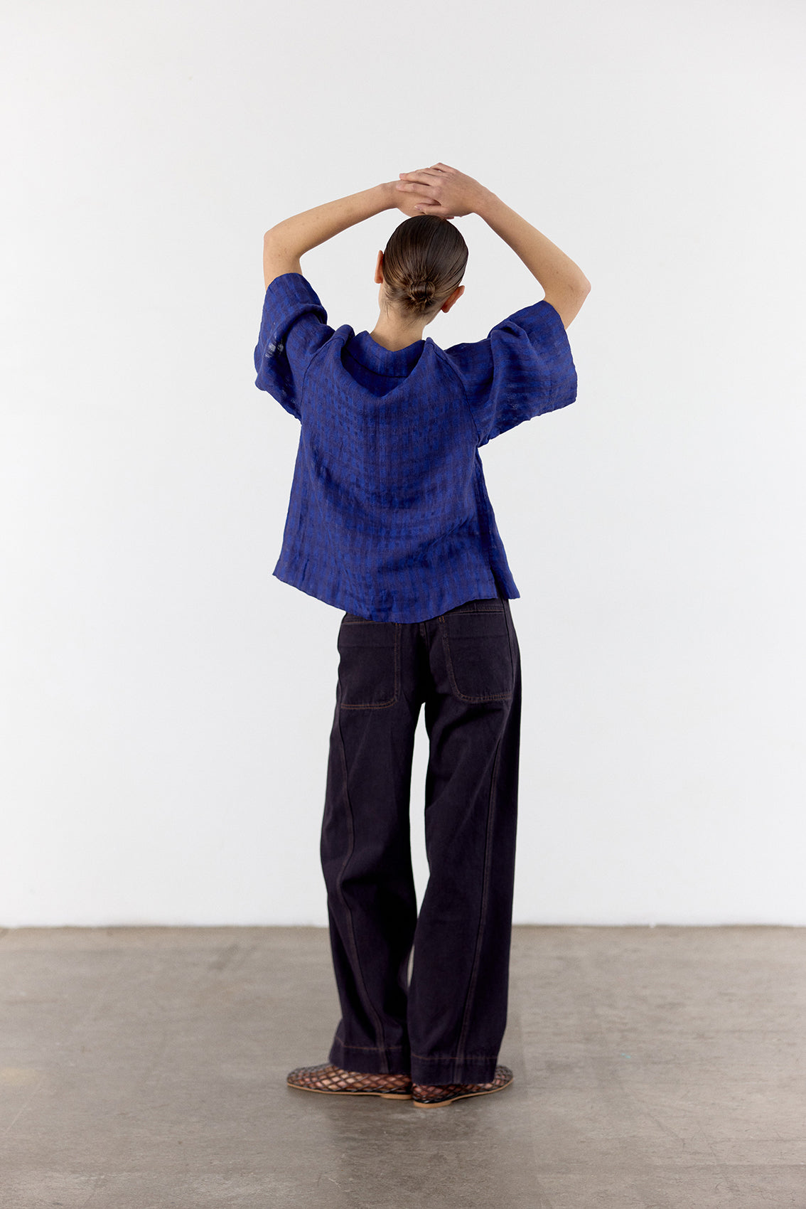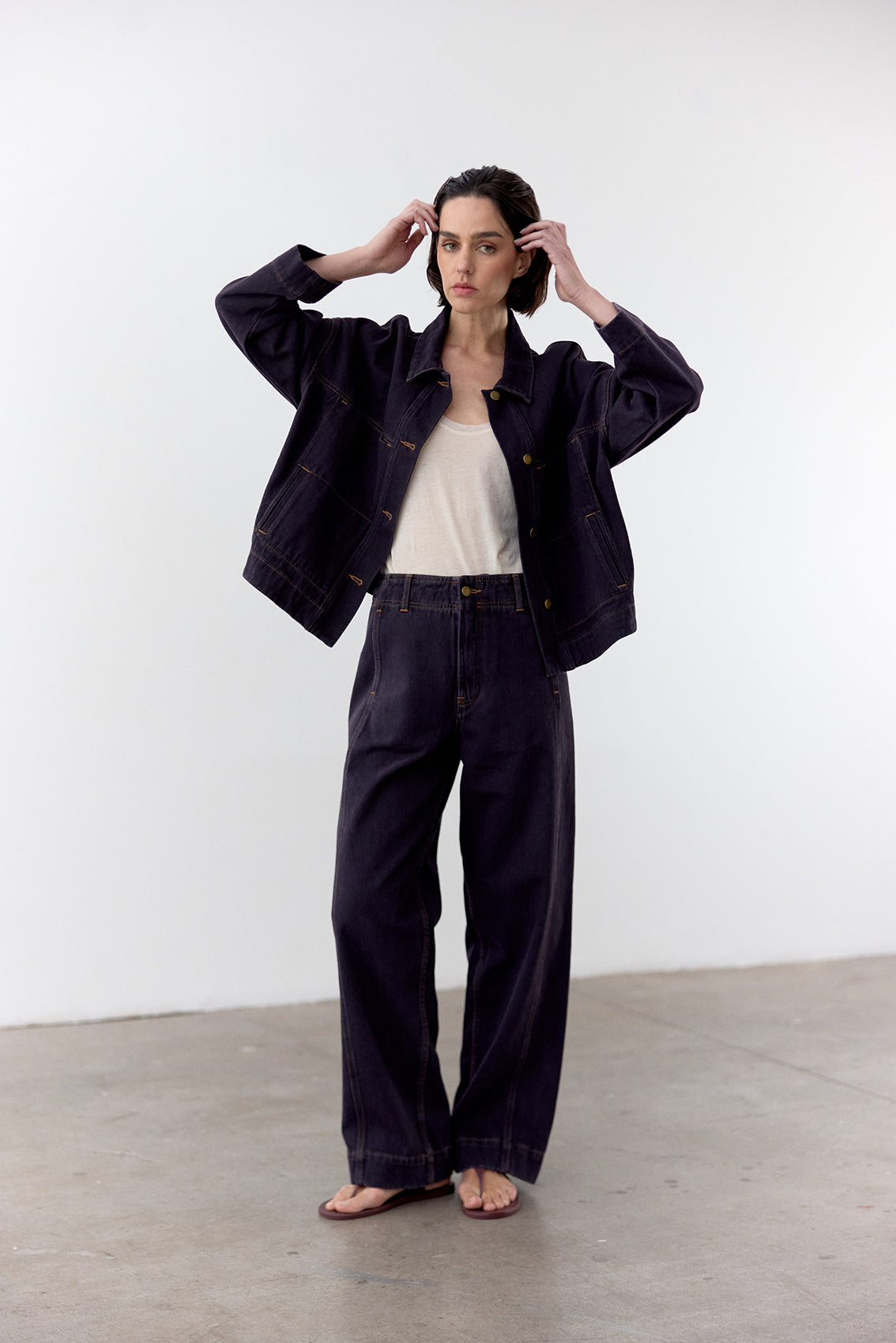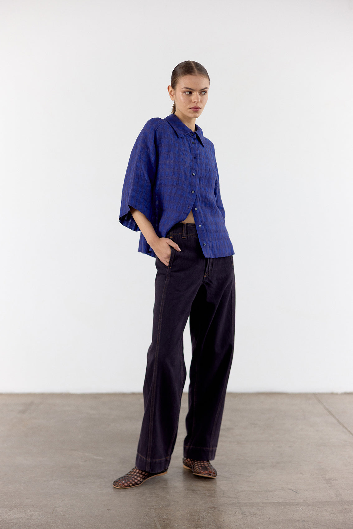 Straight-leg recycled denim jeans, made in 100% cotton. A timeless silhouette with unique design details. These jeans feature subtly displaced lateral cuts that form a flattering side panel where the front and integrated back pockets meet. Finished with classic denim double stitching and a washed denim effect.