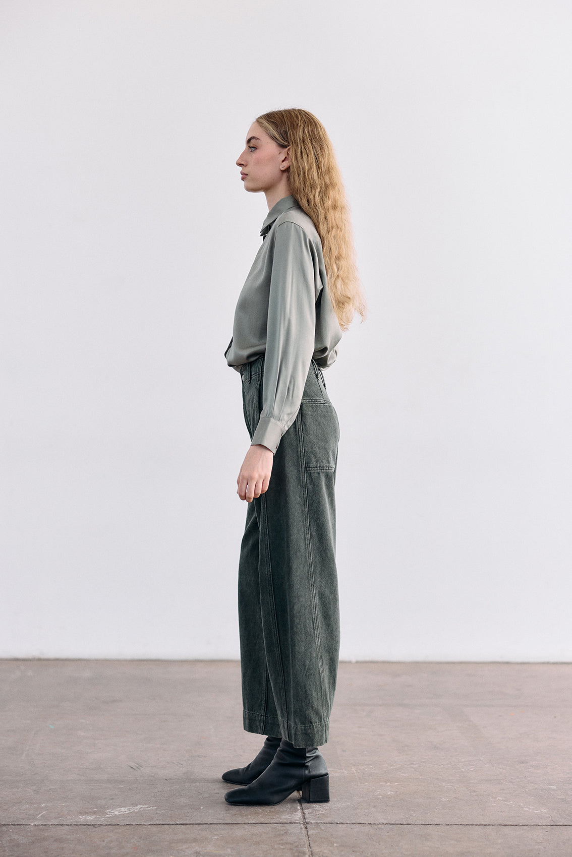 Straight-leg recycled denim jeans, made in 100% cotton. A timeless silhouette with unique design details. These jeans feature subtly displaced lateral cuts that form a flattering side panel where the front and integrated back pockets meet. Finished with classic denim double stitching and a washed denim effect.