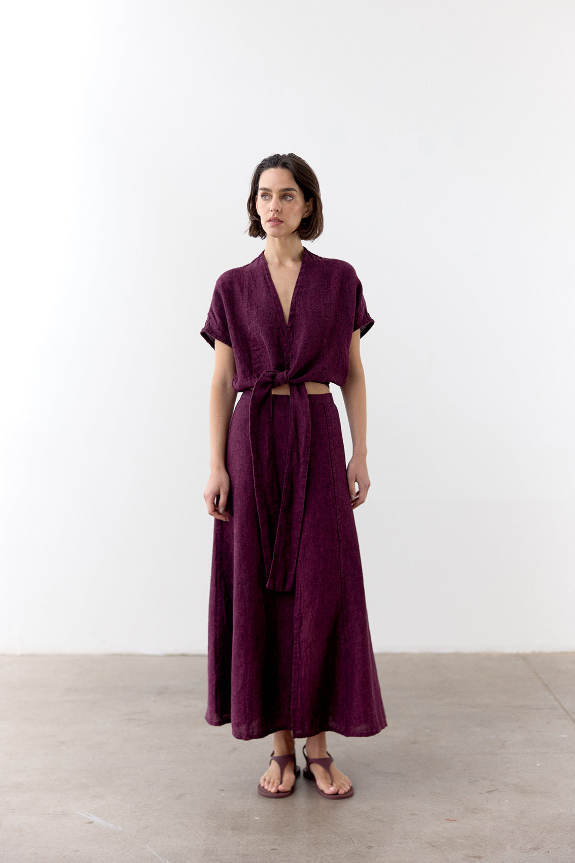 Front-knotted cropped top with v-neck and slightly capped sleeves, made in 100% stone-washed linen.