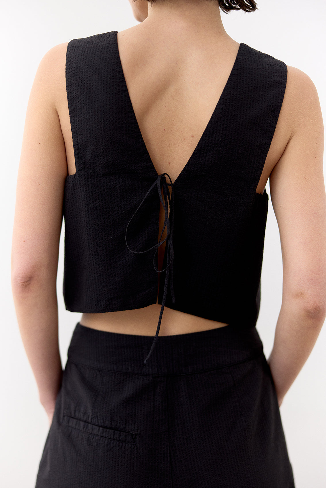 Lightweight sleeveless top with a v-neck in the front and a tied adjustable back. Crafted in 100% cotton with a seersucker effect. An everyday summer essential.