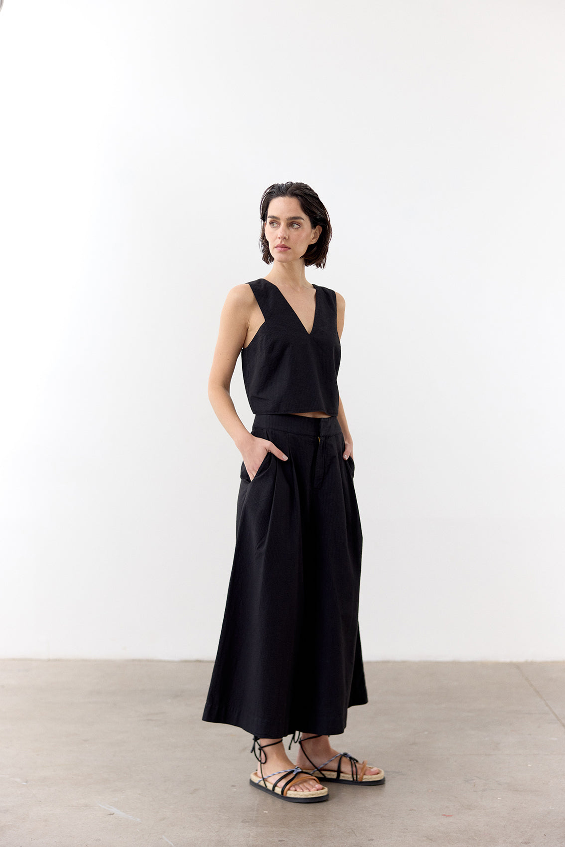 Wide-leg lightweight summer trousers made in 100% cotton with a soft seersucker effect. These high-waisted poplin pants feature front pleats, functional side pockets, a comfortable waistband, and a single back pocket. A relaxed silhouette designed for every day.