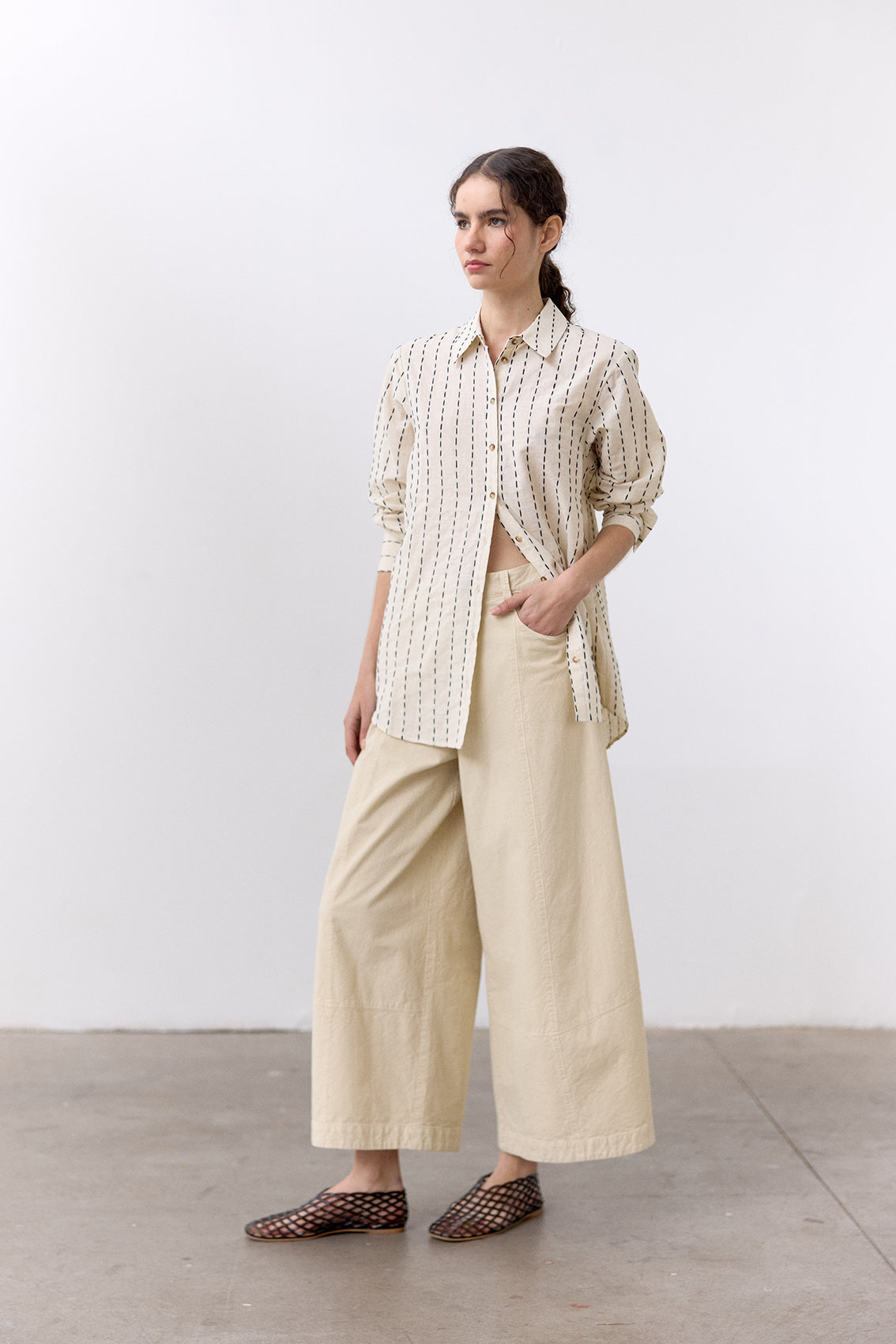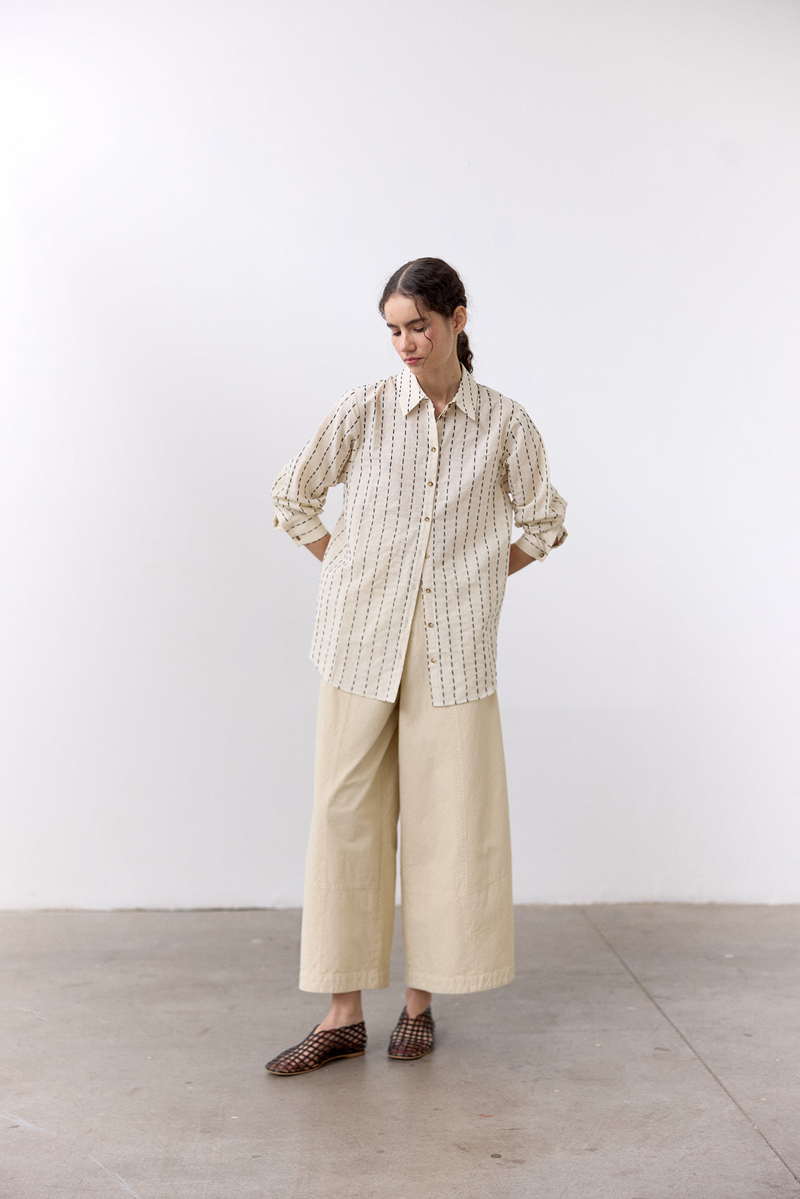 Long-sleeve shirt made in 100% handloom cotton with contrasting black hand-stitching.