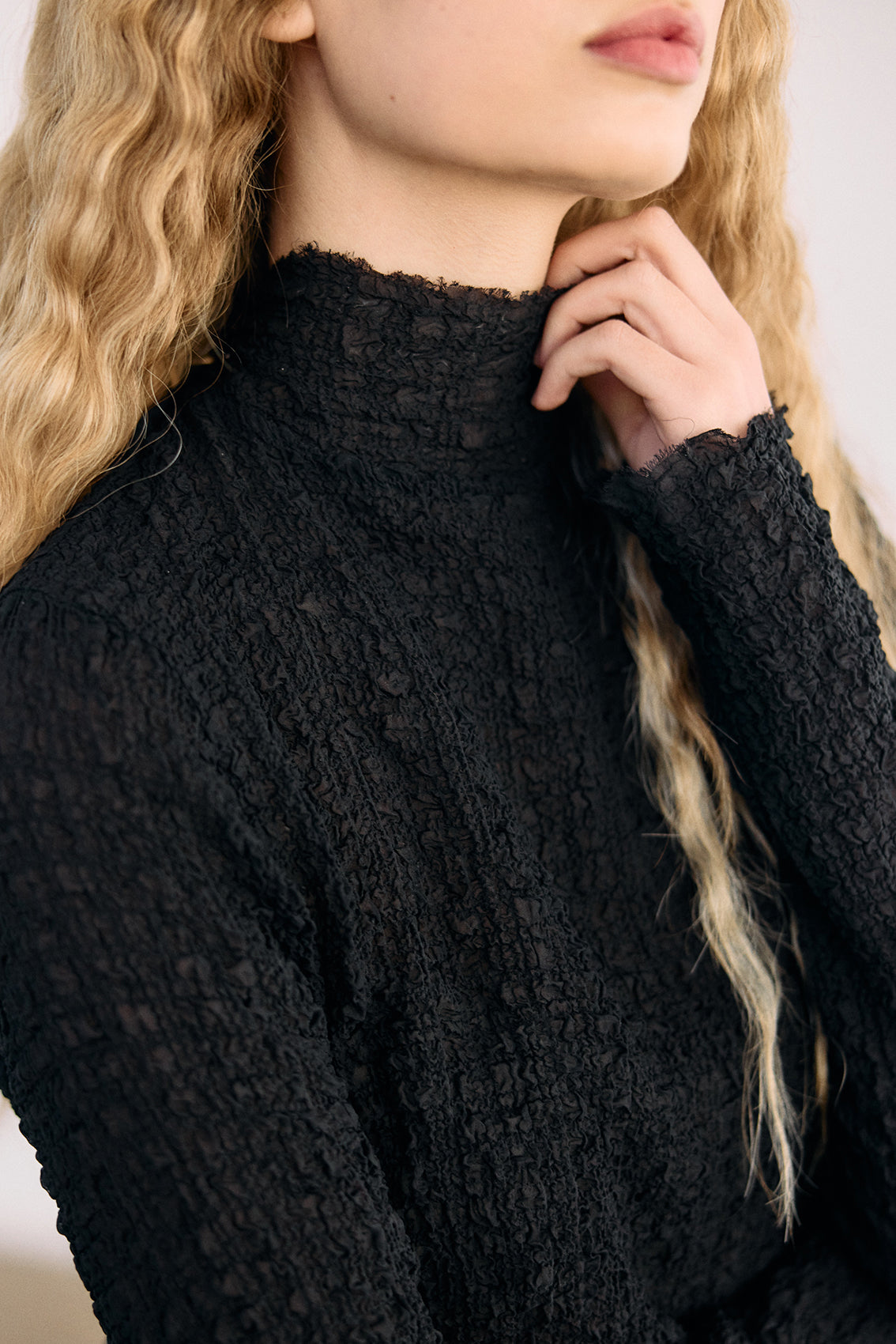Crinkle Texture Silk Turtleneck Top - Ónix