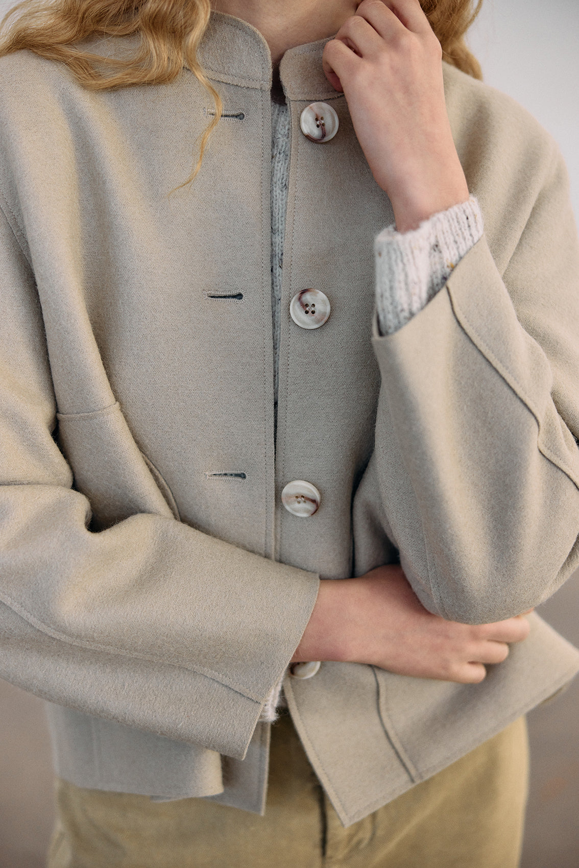 Buttoned short jacket, crafted in a high-quality alpaca and wool blend. It has been treated with a special felting process (professionally boiled in hot water and dried on high heat). The result is a thick yet lightweight and warm natural material.