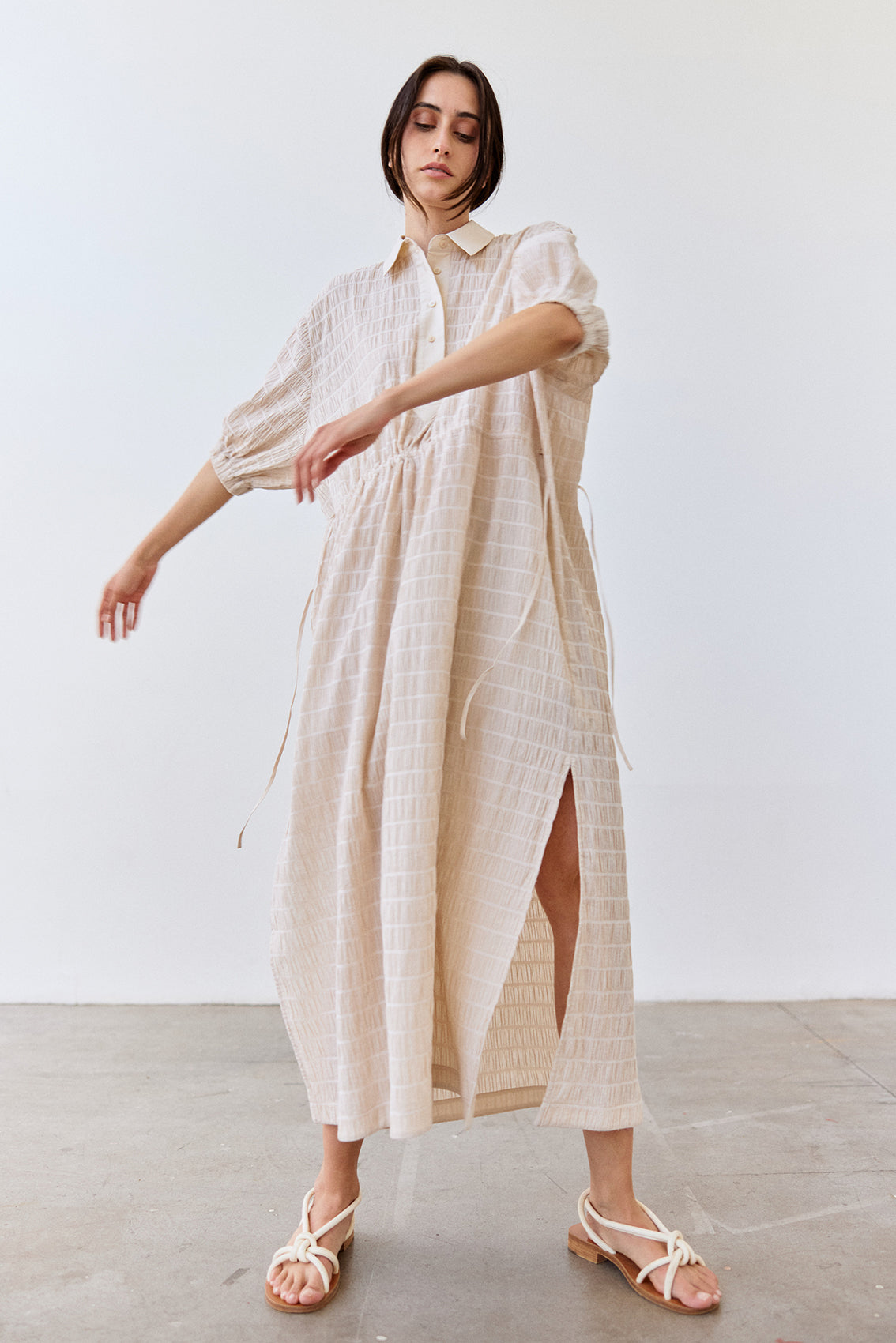 Long, smocked shirt dress, made in Peruvian cotton with delicately gathered fabric details that add dimension and texture. It features adjustable drawstrings at the waist and the back, and a smooth collar and top front button closure. With ample shoulders and comfortable sleeves. A versatile, adaptable shirt dress for every day.