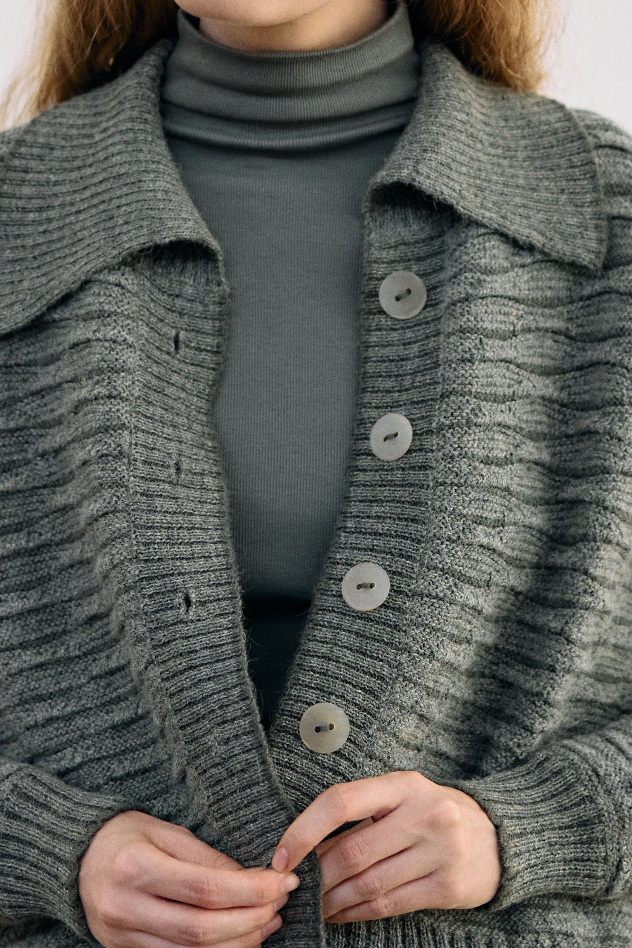 Unique oversized collared cardigan, woven in soft 100% alpaca. Designed with high-relief tubular textures on its surface, using special knitting techniques. A high-quality, carefully crafted, original knitted piece.