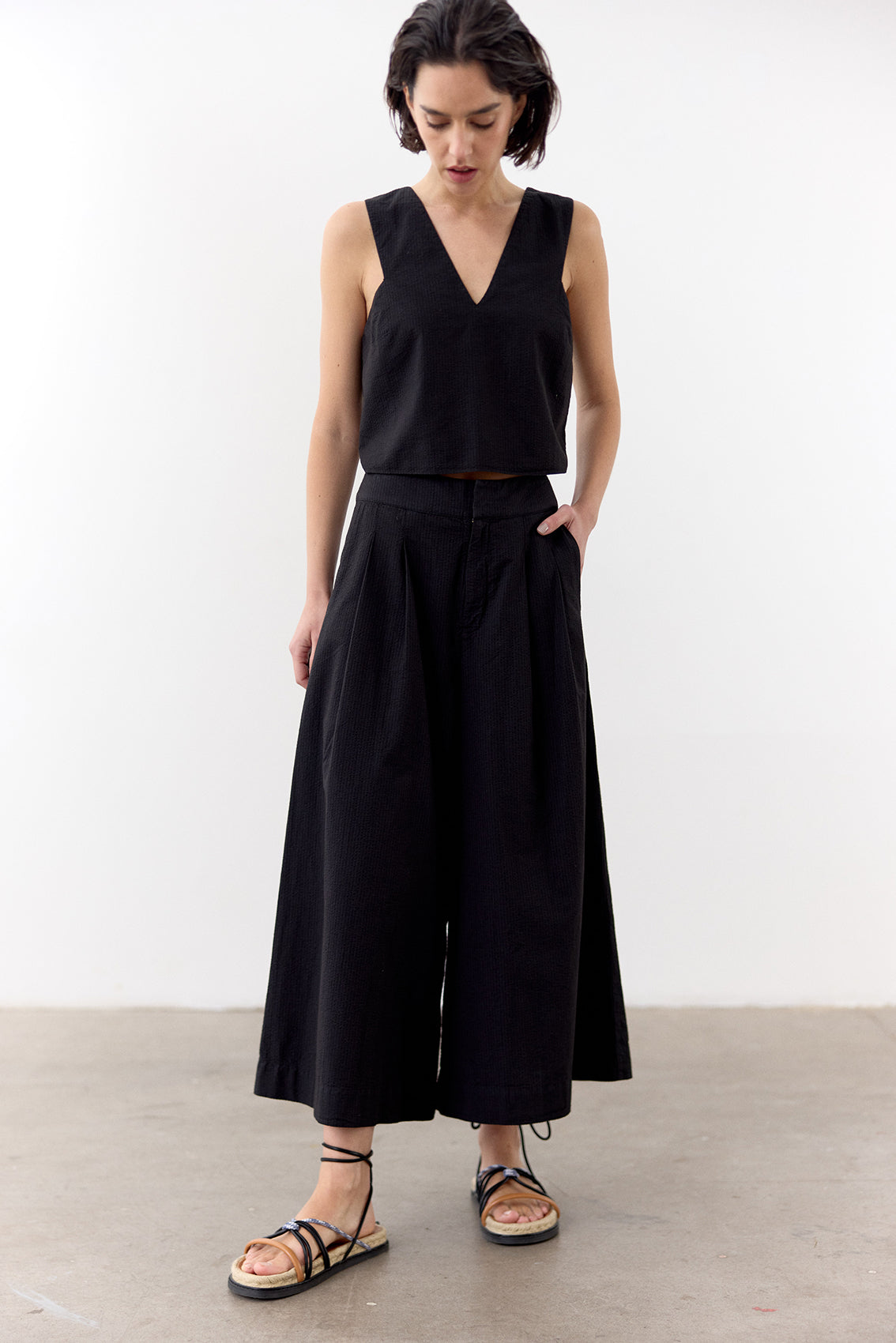 Lightweight sleeveless top with a v-neck in the front and a tied adjustable back. Crafted in 100% cotton with a seersucker effect. An everyday summer essential.