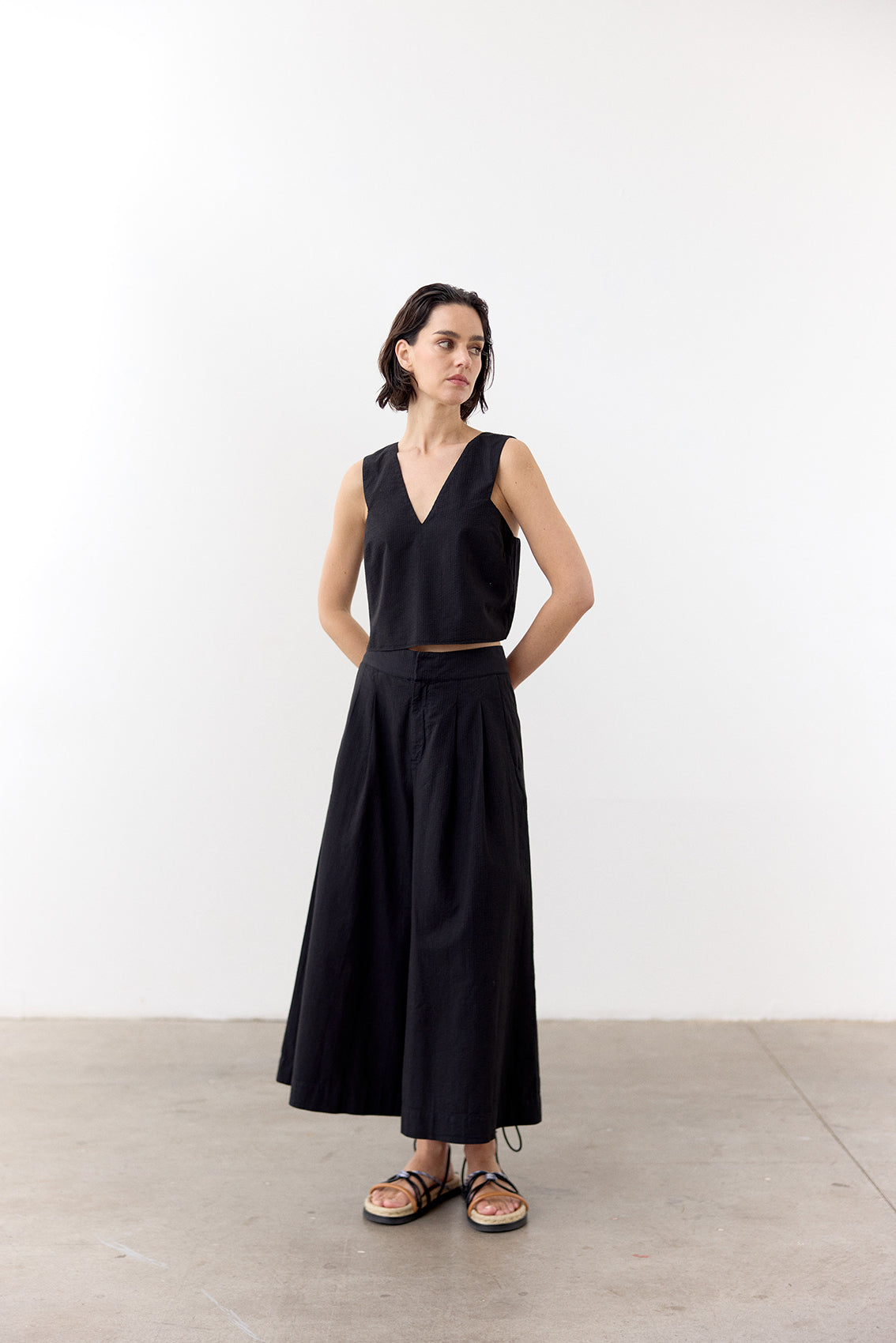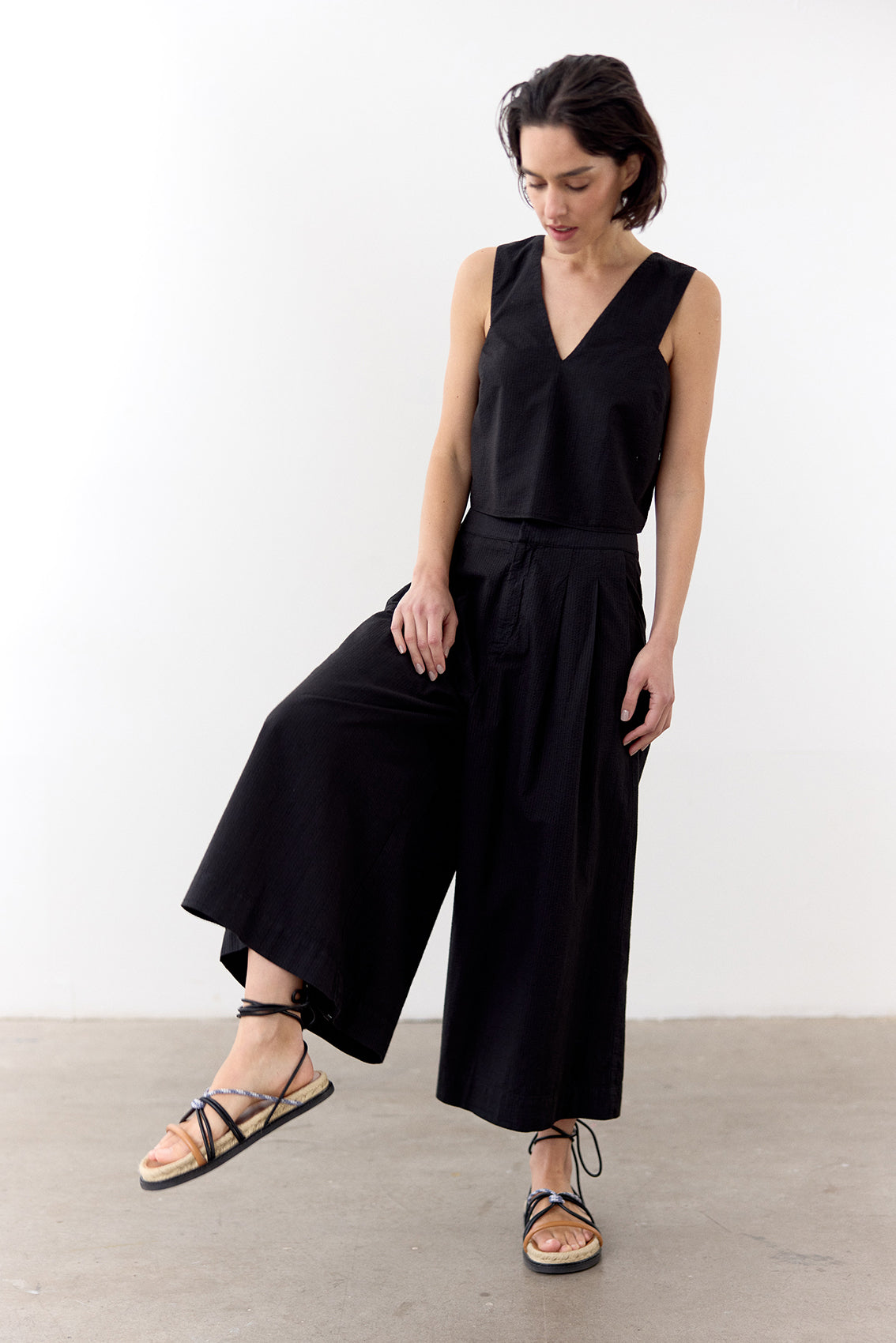 Wide-leg lightweight summer trousers made in 100% cotton with a soft seersucker effect. These high-waisted poplin pants feature front pleats, functional side pockets, a comfortable waistband, and a single back pocket. A relaxed silhouette designed for every day.